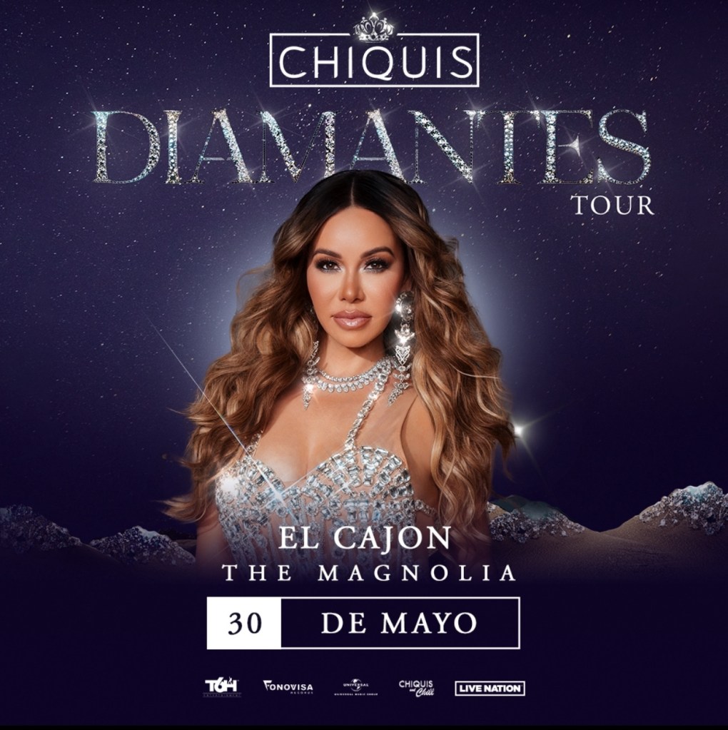 11 de Marzo, 2024 La estrella mexicana del regional mexicano, CHIQUIS, sorprendió hoy a sus fans con el anuncio de su gira DIAMANTES TOUR, un espectáculo renovado y lleno de energía donde la cantante interpretará sus grandes éxitos acompañada de su Banda Abeja Reina. La gira, producida por Live Nation, comenzará el 30 de mayo en el teatro The Magnolia en El Cajón y recorrerá las principales ciudades de Estados Unidos y México.