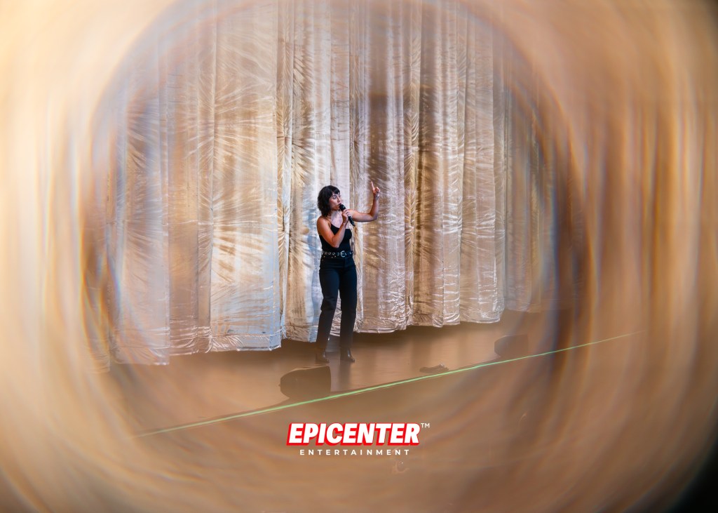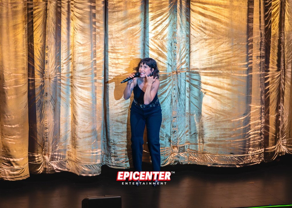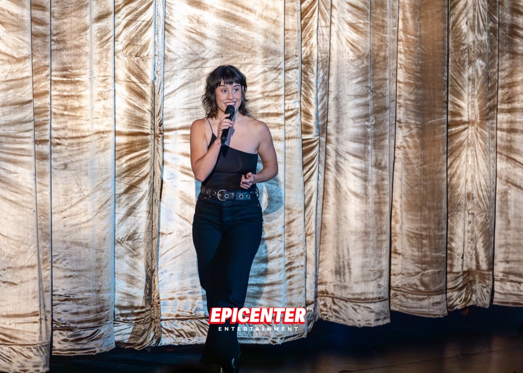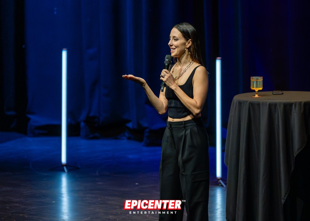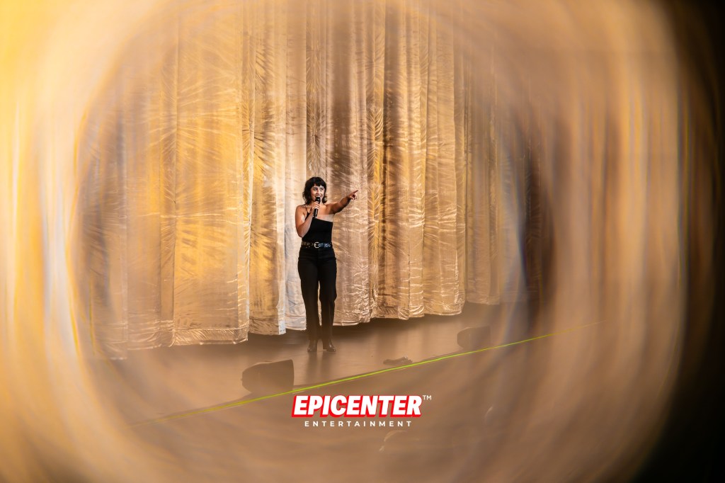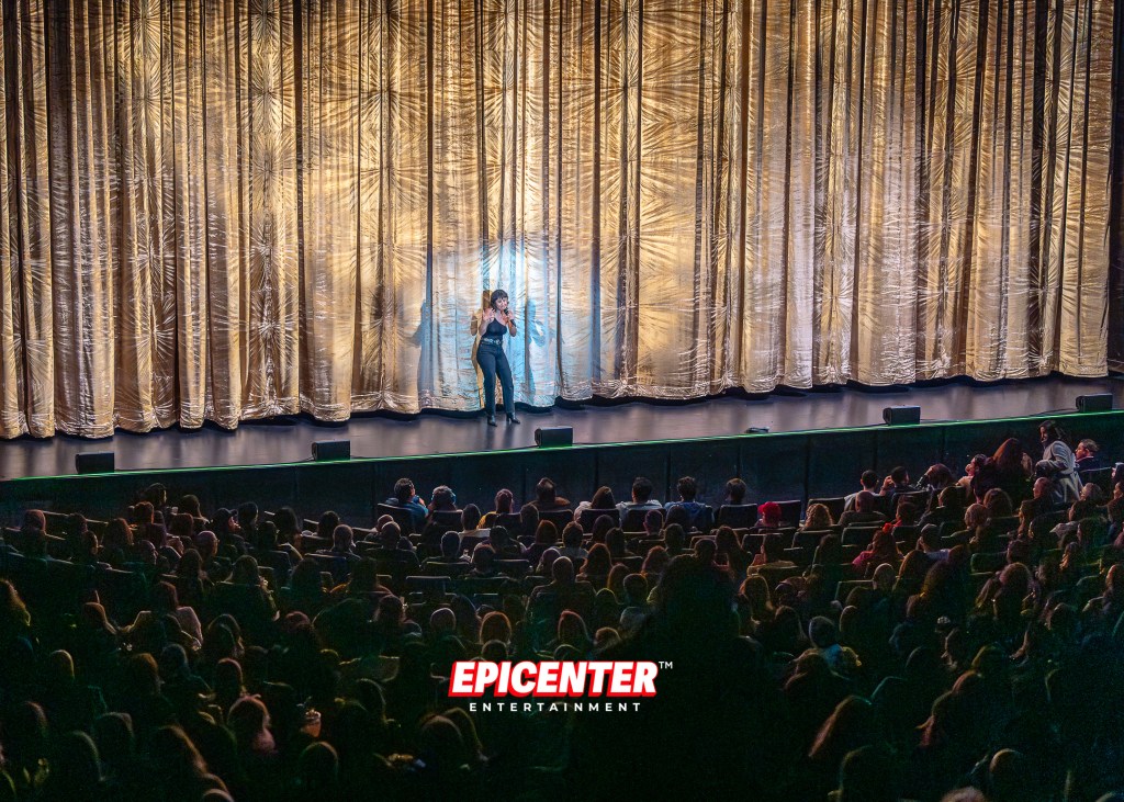 A las 8:30 PM, el telón del Magnolia se elevó para recibir a Sofía. Vestida completamente de negro y con zapatillas estampadas tipo leopardo, la comediante comenzó su rutina con una pregunta ingeniosa: «¿Cómo saludar, San Diego o el Cajón?». La audiencia estalló en carcajadas ante esta ocurrencia, y Sofía continuó compartiendo vivencias como madre y otros aspectos de su vida familiar.