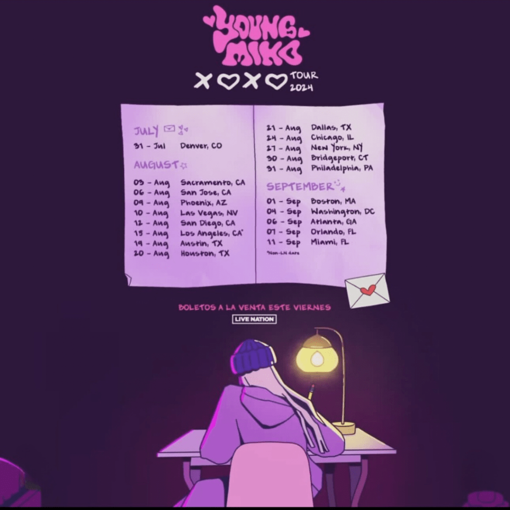 El viaje musical de Young Miko comienza el 31 de julio en el Fillmore Auditorium en Denver, CO, y se extenderá a través de emblemáticos escenarios como el San Jose Civic y el legendario Theater at Madison Square Garden. Este tour es una declaración de la artista, consolidándose como una de las voces más influyentes y refrescantes del año.