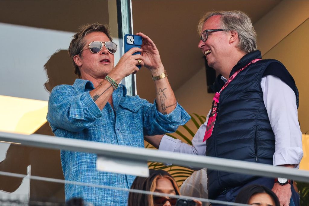 El domingo, tras sus escenas en el Drivers Parade, tanto Pitt como Bacheta disfrutaron de la carrera desde las gradas ubicadas en el edificio de pits, junto con otras celebridades como Diego Boneta, donde celebraron el triunfo del español Carlos Sainz.